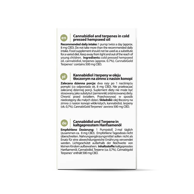 CBD terpeni 500 mg so edinstvena kombinacija vrhunskega konopljinega olja, čistega CBD-ja in natančne sestave terpenov, ki so jih izbrali laboratorijski znanstveniki za sinergijski učinek s CBD-jem. Uporaba steklene embalaže zagotavlja trajnost izdelka, sodoben priročen dozirnik pa omogoča natančno odmerjanje.